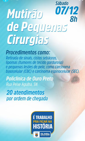 A prefeitura realizará, neste sábado, dia 07/12, um mutirão para a realização de pequenas cirurgias. Serão procedimentos como retirada de