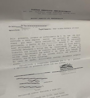 A empresa de terceirização de serviços Toppus, que presta serviços à Prefeitura, enviou notificações de aviso prévio a mais de